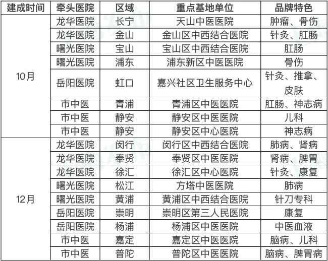 市卫健委说,本市将在中医“区域+专科”医联体建设基础上,以区属医疗机构为核心,打造市级专科专病资源全要素下沉的“一区一品牌”重点基地,让市民在家门口就能享受到名科名医一体化中医药服务,将海派中医专科的金字招牌延伸到基层。2021年10月,完成首批“一区一品牌”重点基地建设;2021年底,完成其余“一区一品牌”重点基地建设,实现16个区全覆盖。各区已确定的重点基地见↓