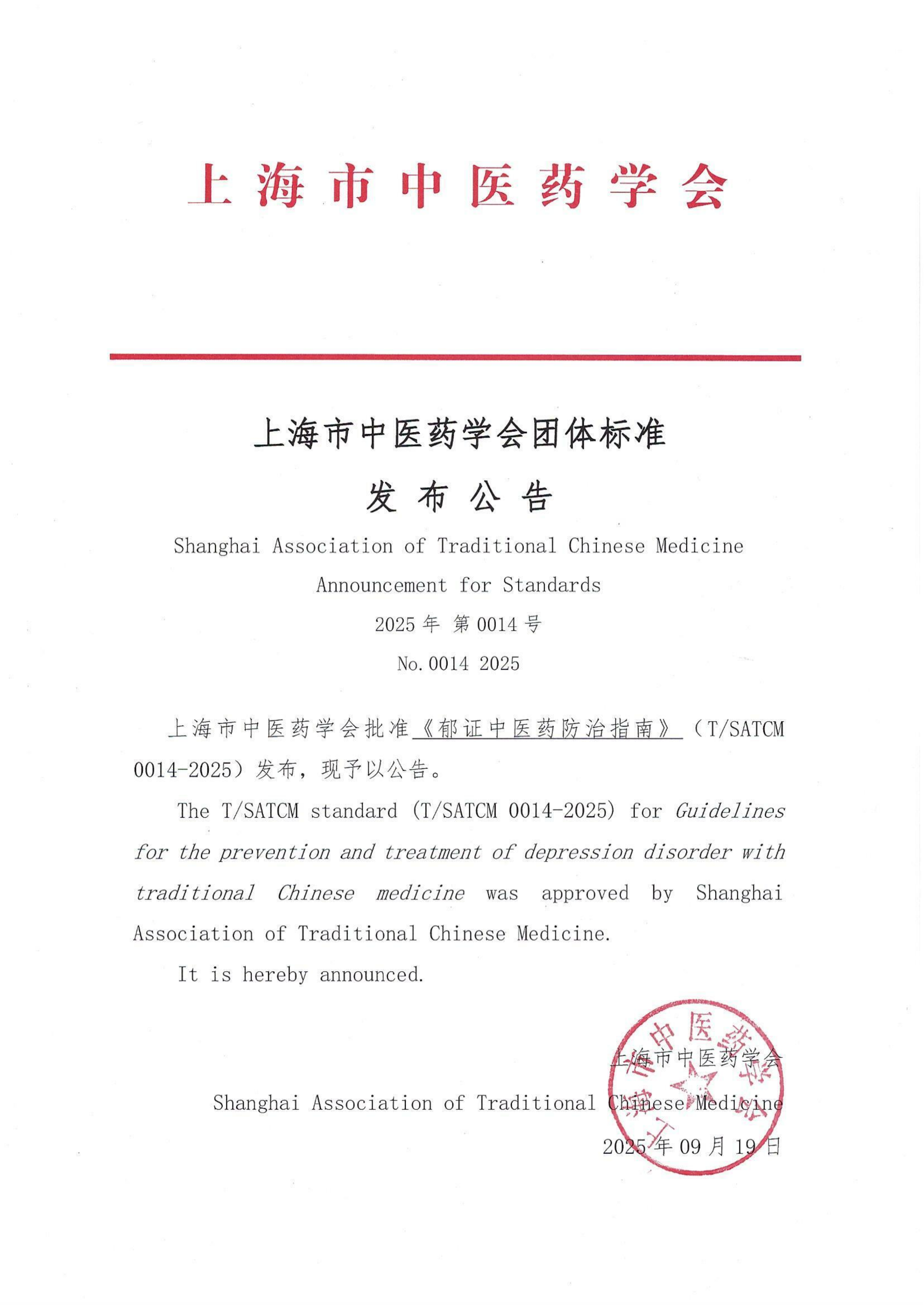 上海市中医药学会《郁证中医药防治指南》发布公告