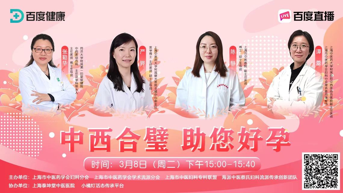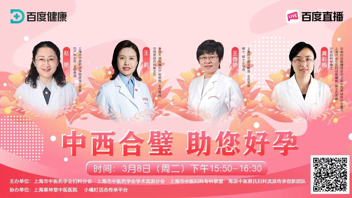 为庆祝“三•八”国际劳动妇女节,响应国家生育开放政策的号召,3月8日下午,由上海市中医药学会妇科分会牵头,联合上海市中医药学会学术流派分会、上海市中医妇科专科联盟等主办,上海泰坤堂中医医院、小橘灯活态传承平台协办的“中西合璧,助您好孕-妇科专家带你了解如何科学合理备孕”线上直播活动在百度直播、百度健康等媒体平台同步直播。