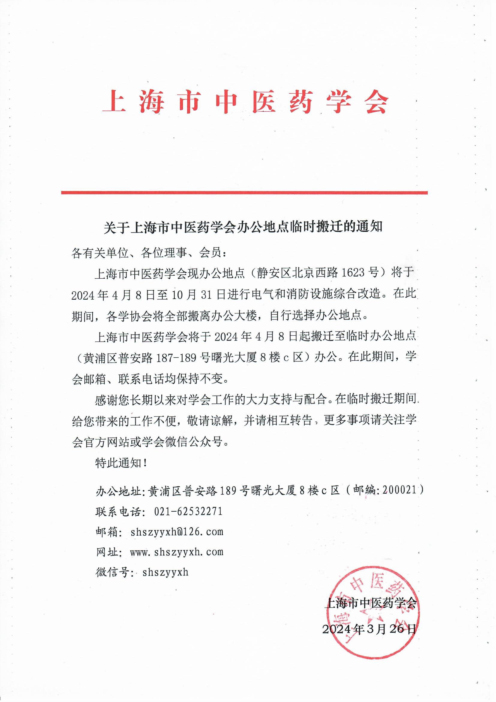上海市中医药学会将于2024年4月8日起搬迁至临时办公地点(黄浦区普安路187-189号曙光大厦8楼c区)办公。在此期间,学会邮箱、联系电话均保持不变。
