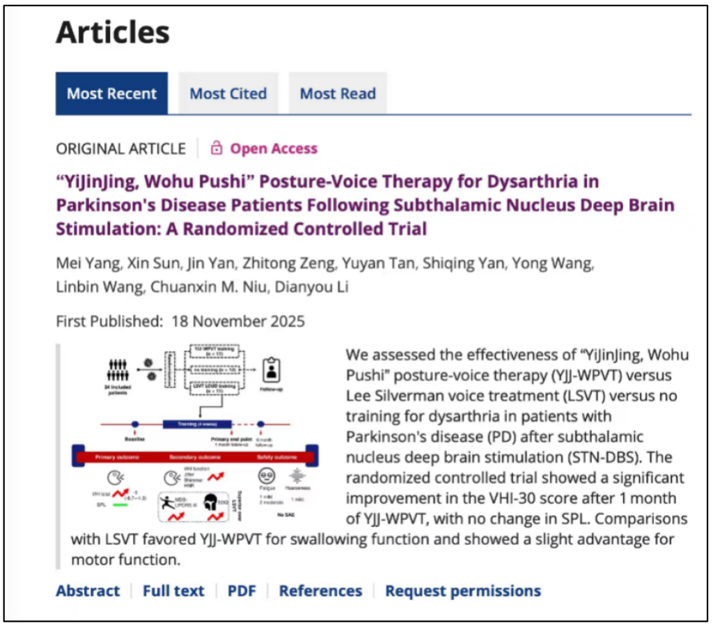 为破解这一难题,上海交通大学医学院附属瑞金医院神经外科主任医师李殿友、康复医学科副主任牛传欣团队,与第五批国家级非物质文化遗产“古本易筋经十二势导引法”代表性传承人严石卿携手,将中医智慧融入现代康复治疗。目前该临床研究成果已在国际权威期刊《中枢神经系统神经科学与治疗学》发表,获得国际学术界认可。