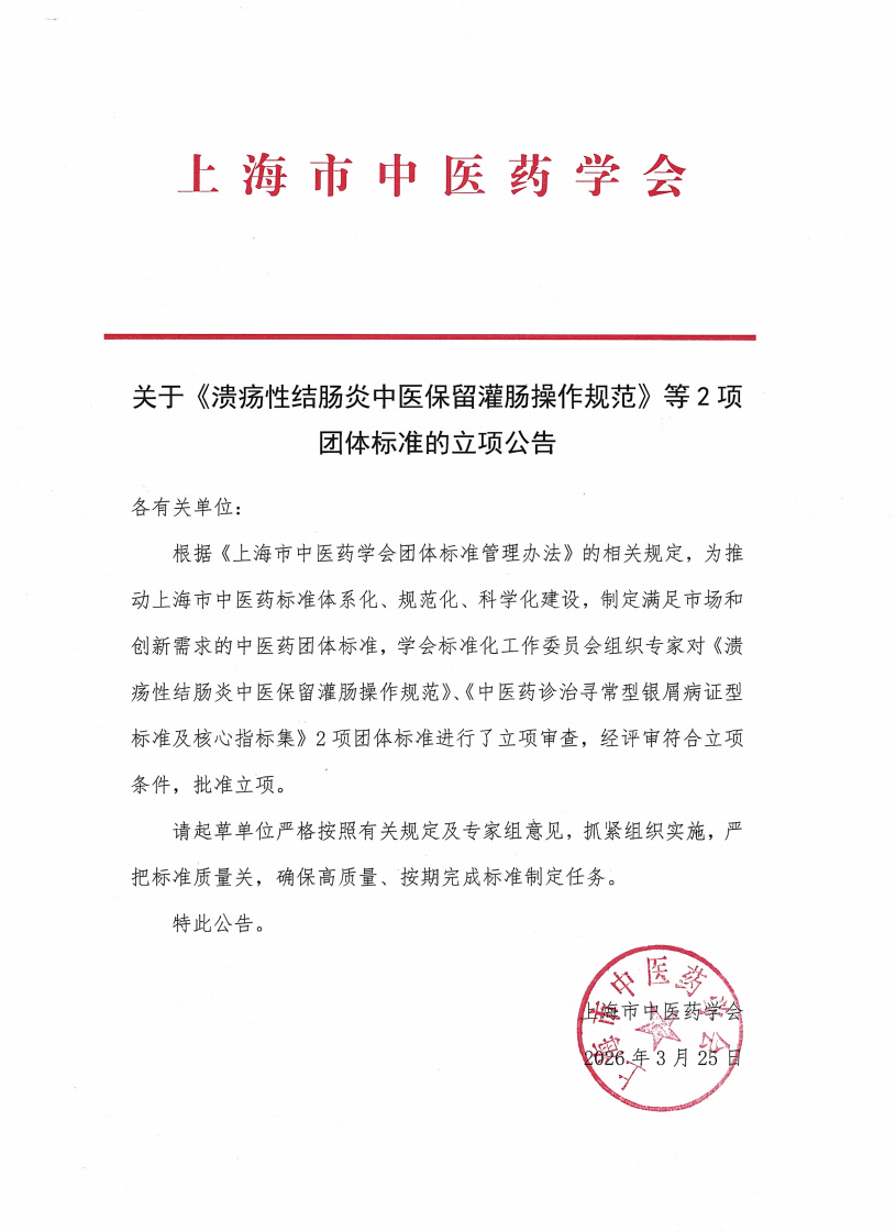 关于《溃疡性结肠炎中医保留灌肠操作规范》等2项团体标准的立项公告